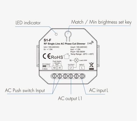 Single Line AC Phase Cut RF Dimmer, 200W, Push+RF(RU4)